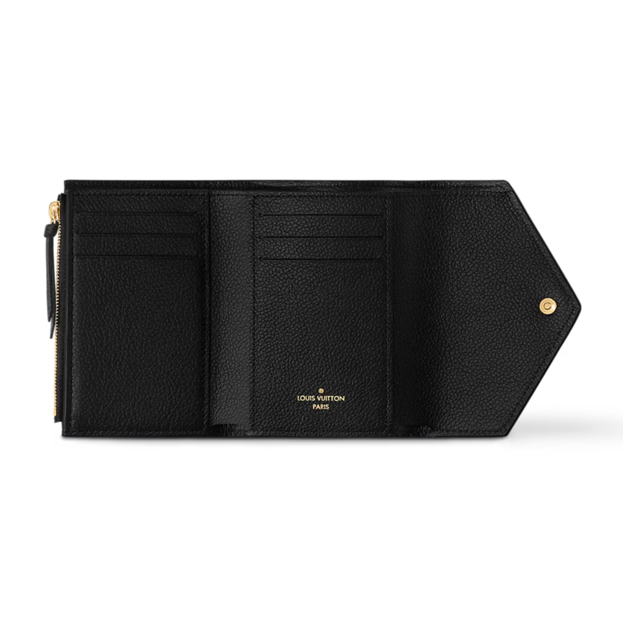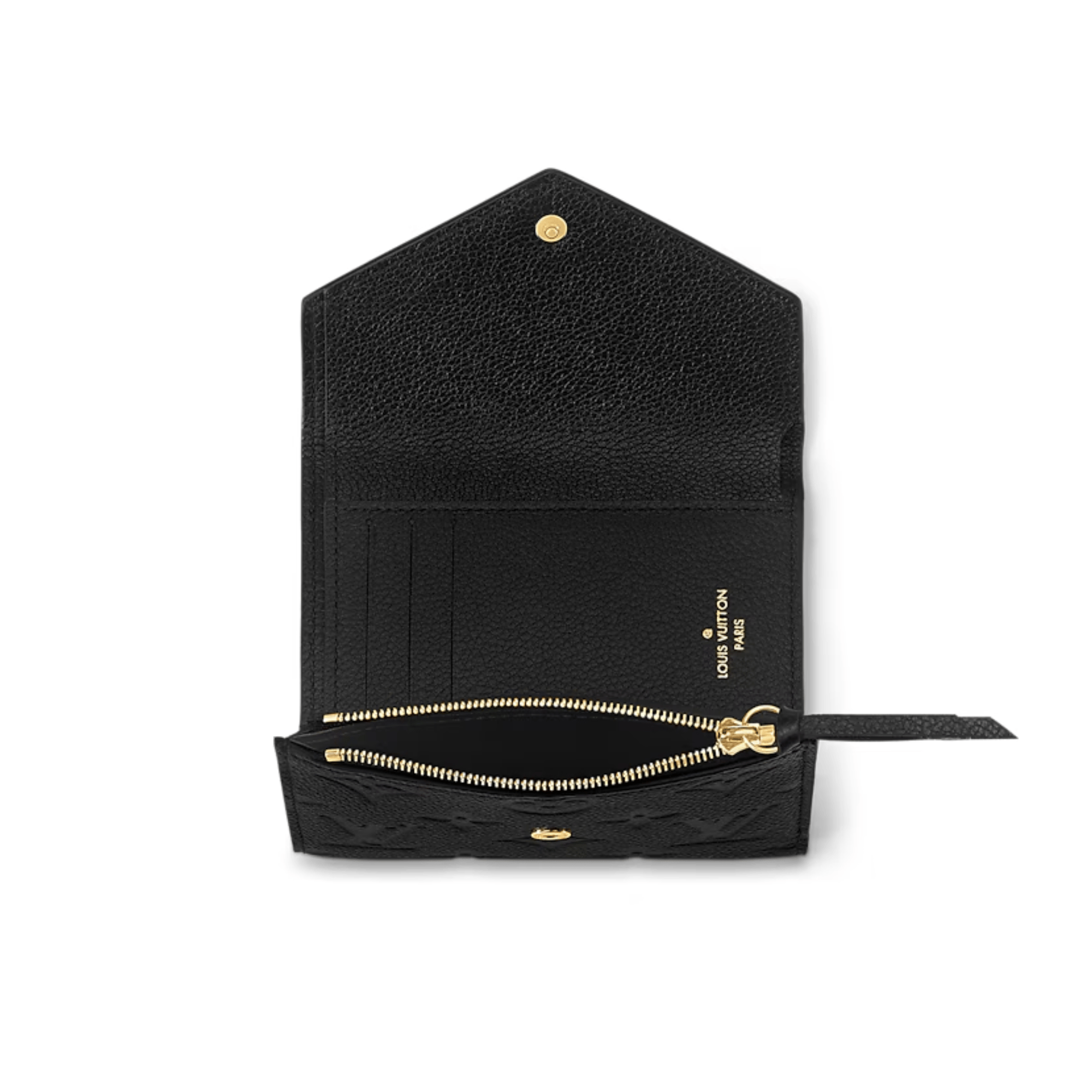 The Victorine envelope-style wallet is crafted from supple Monogram Empreinte leather, embossed with the iconic Monogram pattern. This compact, feminine wallet is characterized by its exceptionally functional design, which opens out to reveal an array of practical features, including card slots, a pocket for bills and a zipped coin compartment on the side.