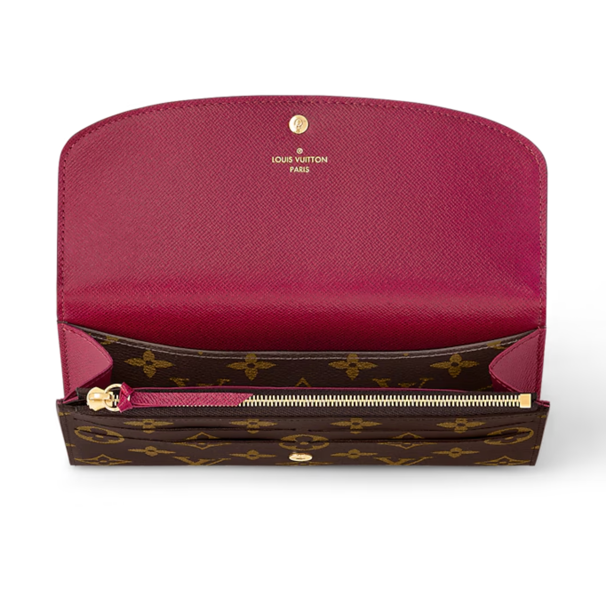 Proving that functionality and beautiful design can go together, the Emilie Wallet is elegance itself in supple Monogram canvas with a fresh lining color. Numerous pockets and an attractive shape make it irresistible.