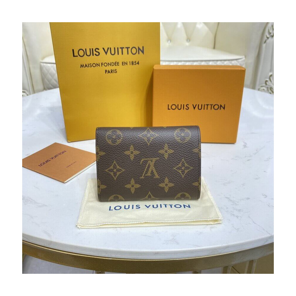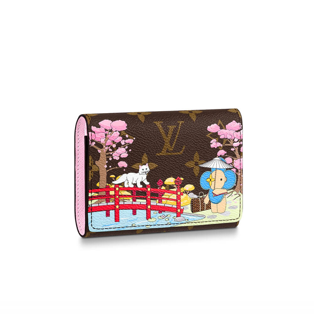 Made from Monogram leather, the compact Victorine Wallet is decorated with a whimsical print of Vivienne, the Louis Vuitton mascot, in a traditional Japanese garden. A friendly white cat stands on the red bridge and stares at Vivienne as Sakura trees blossom behind. This tiny, envelope-style wallet is lined with Wisteria Pink leather.